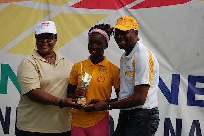 Omolayo Bamidele winner Girls 16 & MOP receiving from Ogunjoye and Ikhana Mborah of the Sports Ministry. |